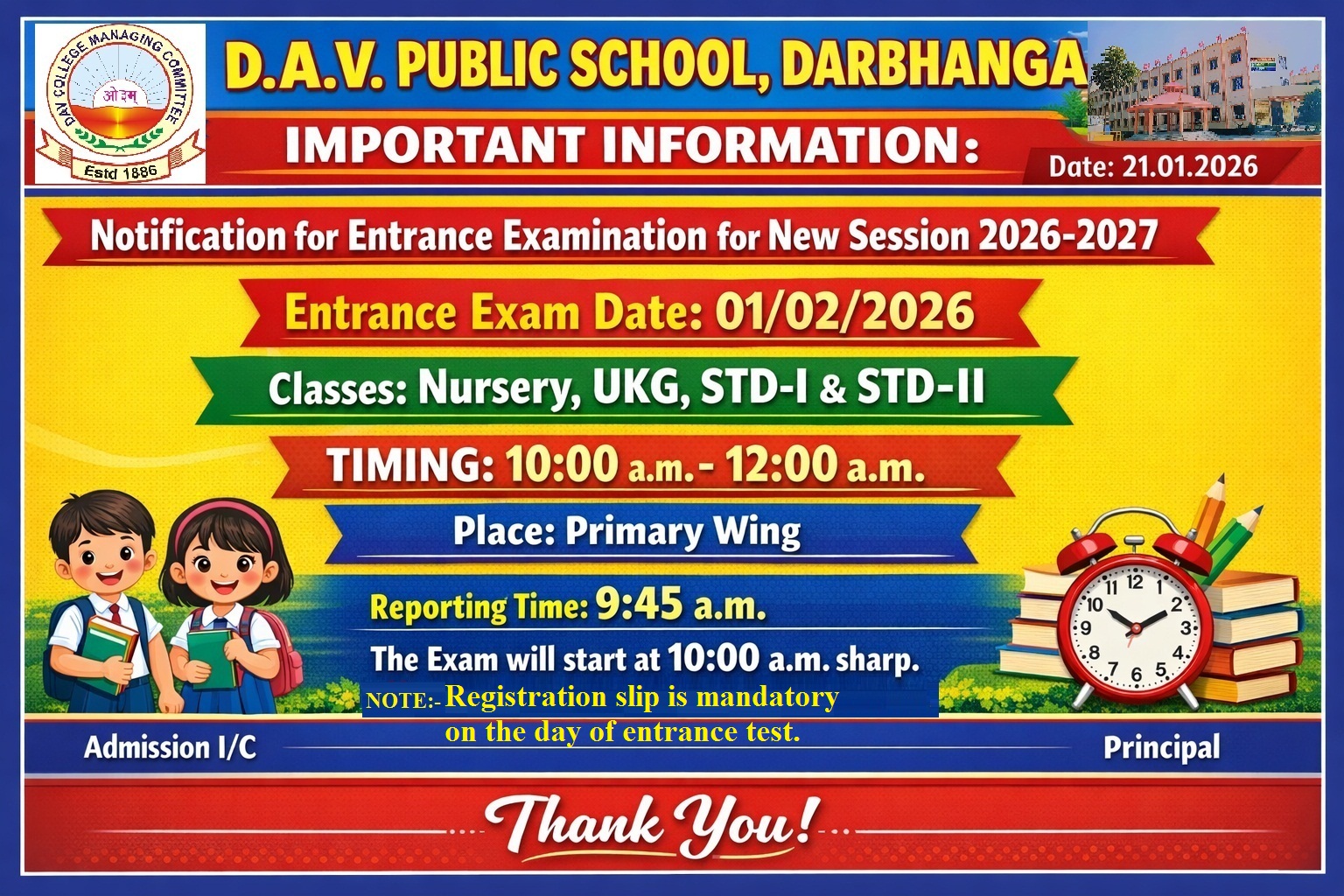 The Entrance Examination (Phase -II) for New Session 2025-2026 is scheduled to be held on 23/02/2025 at 10:00 AM - 12:00 PM.