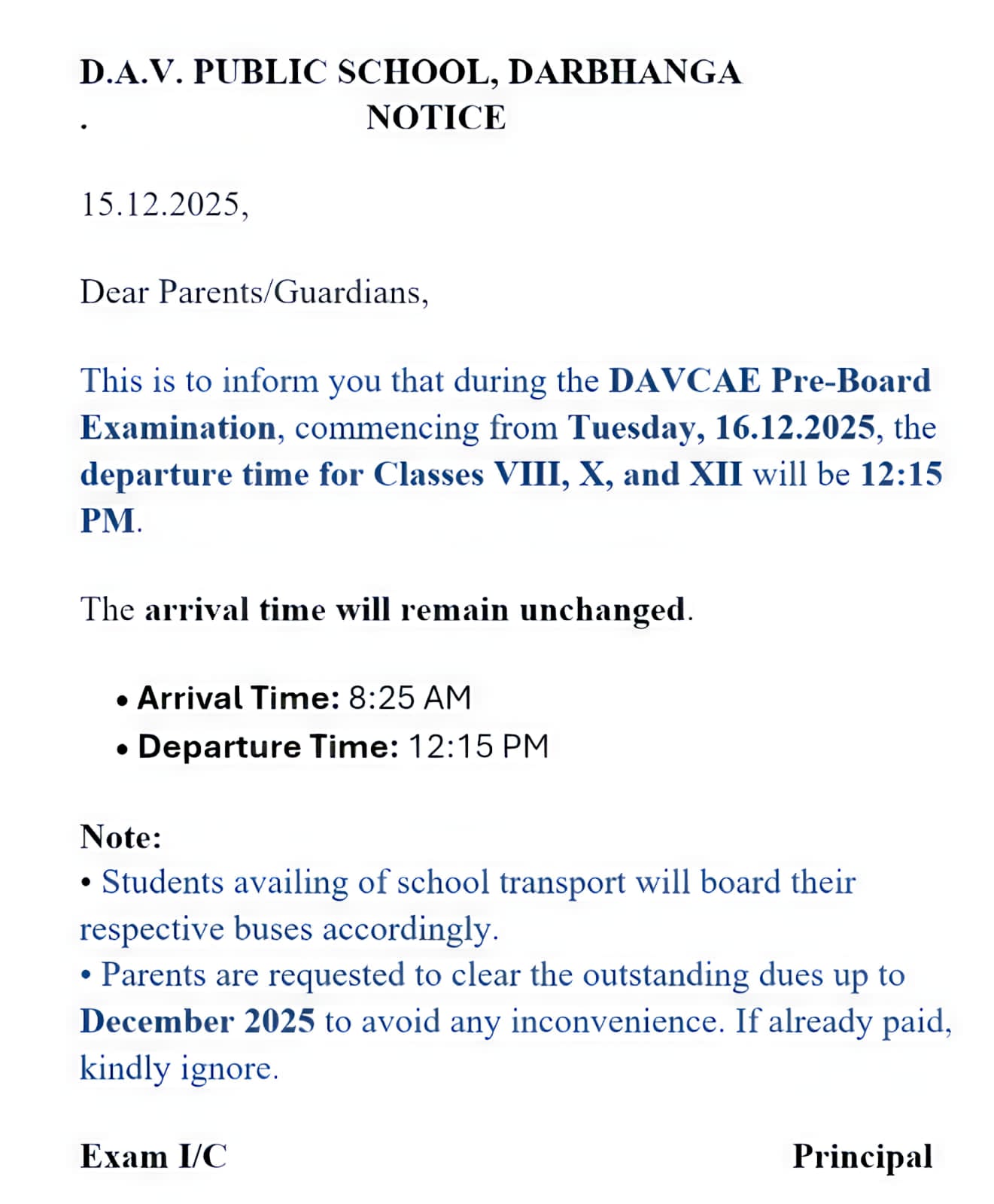DAVCAE Pre-Board Examination, commencing from Tuesday, 16.12.2025, the departure time for Classes VIII, X, and XII will be 12:15 PM.